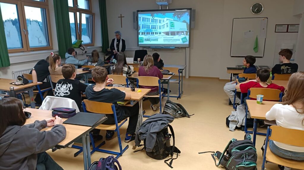 Am Montag (15.12.) stellte Frau Direktor Mag. Dorfinger in der BO-Std. die HAK Zwettl vor. Sie ging besonders auf Unternehmensführung (Entrepreneurship Education) und kaufmännische Schwerpunkte ein, aber auch auf die Wirtschaftsakademie Waldviertel (Zwettl, Horn, Waidhofen, Gmünd) und alle diesbezüglichen Schwerpunkte, die man ja (virtuell) von einem Standort aus wählen kann. PferdeHAK oder HolzHAK können in Kooperation mit Edelhof zusätzlich besucht werden.
