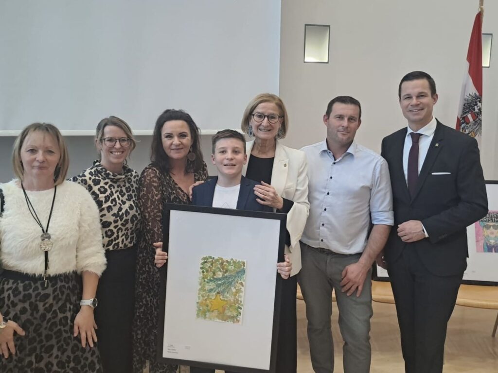 Die Preisverleihung zum Weihnachtspost Wettbewerb WeihnARTlich fand am 16.12.2025 im Landhaus in St. Pölten statt. Bei dieser tollen Veranstaltung wurde dem Sieger Jan Leister aus der 3. Klasse der Mittelschule Schönbach von Landeshauptfrau Johanna Mikl-Leitner gemeinsam mit Bildungsdirektor Karl Fritthum ein großartiger Preis überreicht. Begleitet wurde Jan zu dieser Verleihung von seinen Eltern, der Schulleiterin und seiner Lehrerin. Landeshauptfrau Johanna Mikl–Leitner gestaltet als Präsidentin der Bildungsdirektion für Niederösterreich einen Teil ihrer Weihnachtspost nach Jans Entwurf.