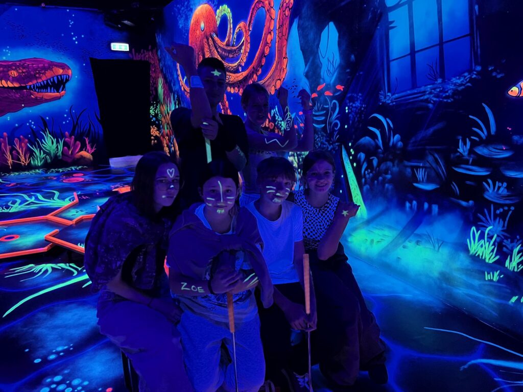 In der zweiten Schulwoche machten sich die 4. Klassen der Mittelschule Schönbach auf eine spannende Reise nach Wien. Bereits am Sonntagabend starteten wir mit einem besonderen Erlebnis: dem Besuch der Blacklite Arena, wo wir im Schwarzlicht-Minigolf unsere Geschicklichkeit unter Beweis stellen konnten. Die leuchtenden Farben und die kreative Gestaltung der Minigolfbahn sorgten für viel Spaß und Begeisterung.